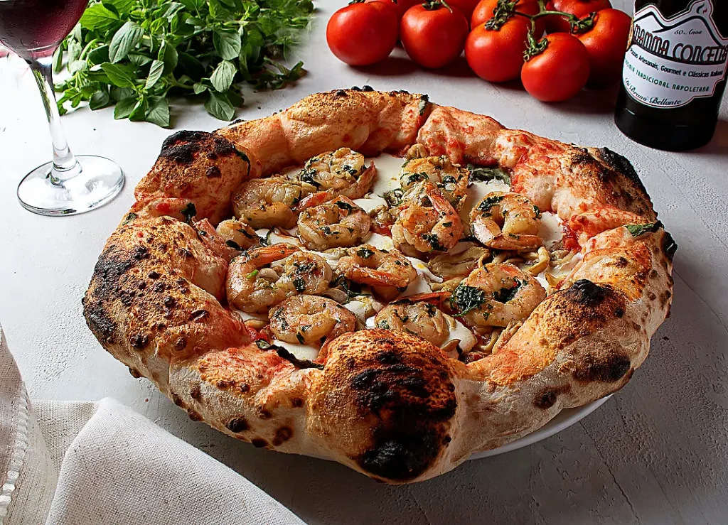 A estrela do cardápio é a clássica Margherita Verace, inspirada diretamente na receita original de Nápoles. A massa passa por fermentação lenta de pelo menos 48 horas e é assada em forno napolitano, garantindo bordas aeradas, leveza e aquele sabor característico que conquista logo na primeira mordida.
