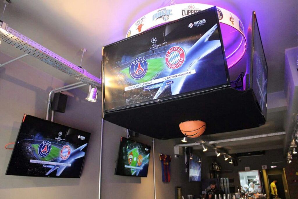 Com proposta inspirada nos tradicionais sports bars, a casa aposta em uma estrutura completa para transmissões ao vivo. São diversas telas espalhadas pelo ambiente, permitindo acompanhar jogos de futebol nacional e internacional, além de ligas como NBA e NFL, o que amplia o público e atrai diferentes perfis de fãs de esporte.